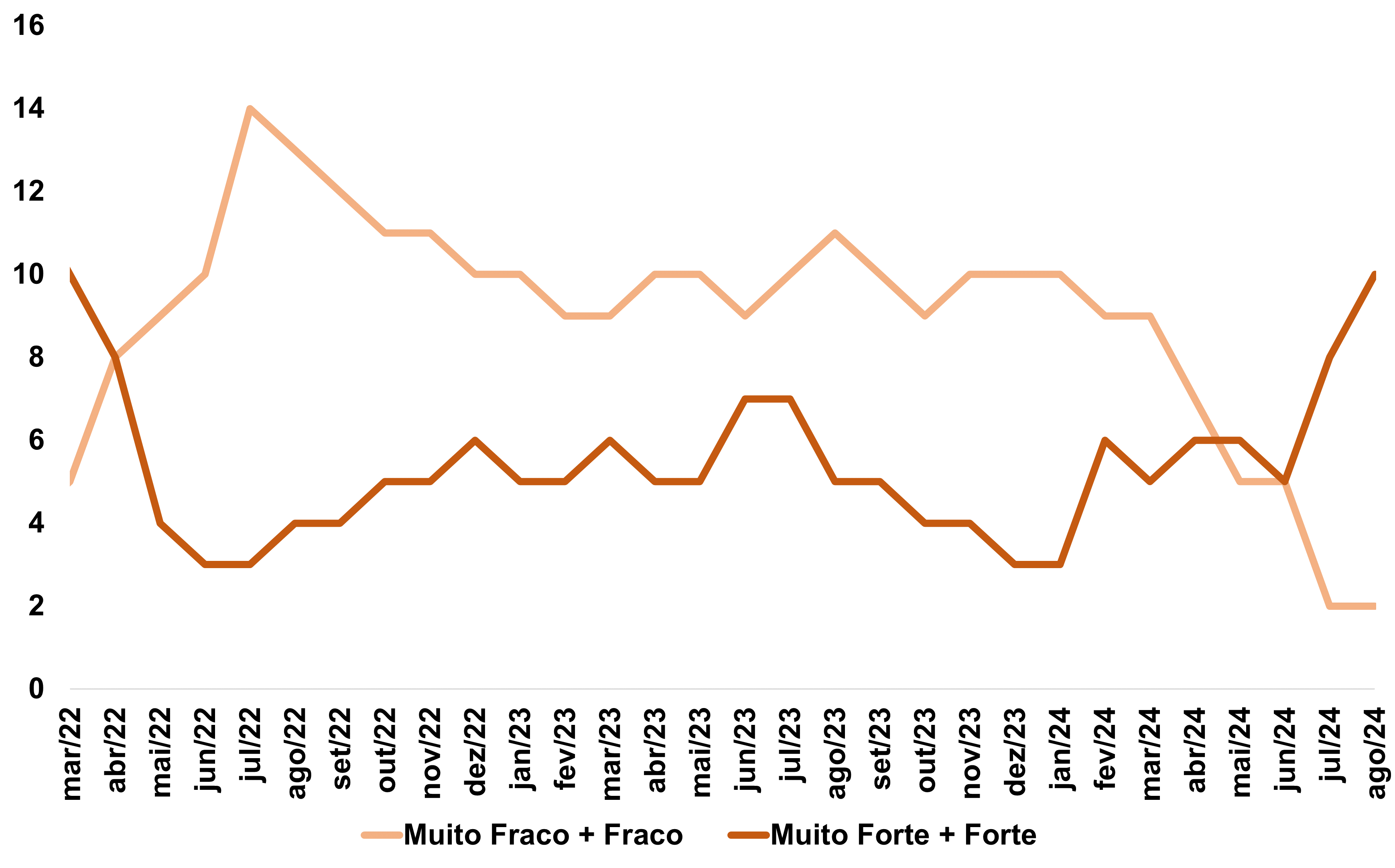 O mapa mostra que, na indústria de transformação, 10 atividades estavam acelerando (Forte+ Muito Forte), 2 atividades desacelerando (Fraca + Muito Fraca) e outros 12 segmentos estáveis em relação à média histórica (Neutro) no mês de agosto de 2024. No mesmo período de 2023, o resultado era inverso, com mais setores arrefecendo (11) em relação aos setores com crescimento Forte ou Muito Forte (5). Portanto, houve um movimento de inflexão, que foi influenciado, sobretudo, pela queda do conjunto de segmentos desacelerando durante os oito primeiros meses de 2024, reforçando o diagnóstico de recuperação da indústria no ano – Gráfico 2.