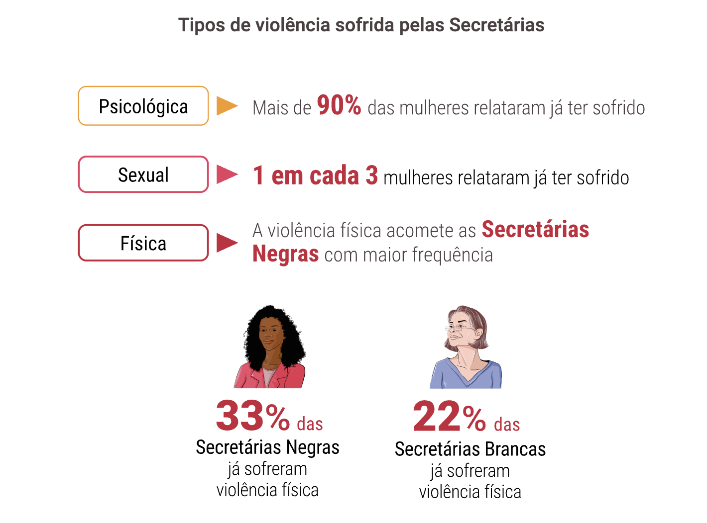 Os dados destacam ainda que uma em cada quatro Secretárias relataram episódios de violência física, muitas vezes em forma de toques sem consentimento durante reuniões ou debates. As Secretárias negras enfrentam índices ainda mais altos: 33% afirmaram já ter sofrido violência física, enquanto entre as brancas o percentual foi de 22%.
