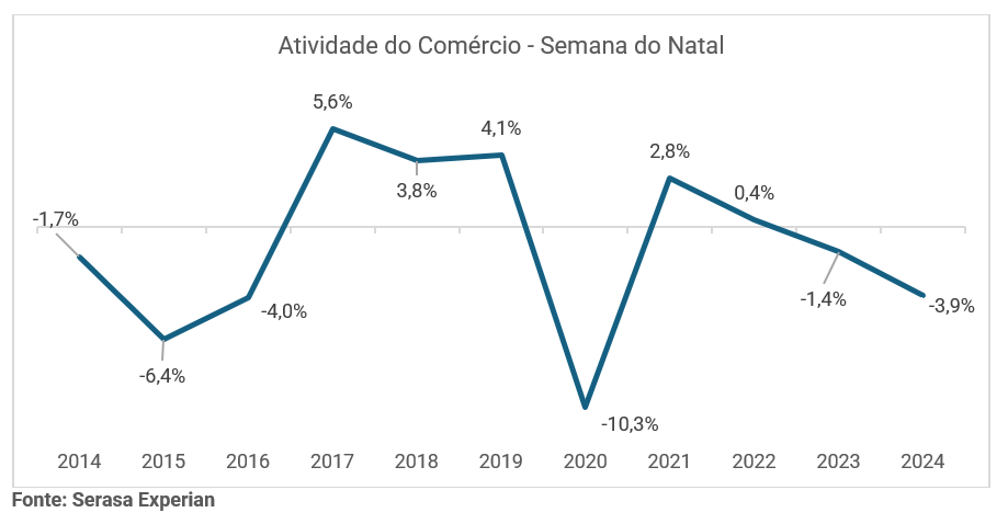 A atividade do comércio físico na semana do Natal de 2024 (18/12/2024 a 24/12/2024) registrou queda de 3,9%, a maior para a data comemorativa desde 2020, quando o índice foi de -10,3%. Os dados são do Indicador de Atividade do Comércio da Serasa Experian, primeira e maior datatech do Brasil. Veja o levantamento dos últimos 10 anos a seguir: