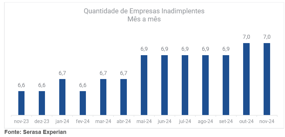 No cenário nacional, em novembro, 7,0 milhões de negócios estavam com contas negativadas no país, representando 31,9% do total de companhias existentes, conforme o Indicador de Inadimplência das Empresas da Serasa Experian, primeira e maior datatech do Brasil. O levantamento também registrou o volume de 50,4 milhões de dívidas no mês, que equivalem a soma de R$ 153,4 bilhões. Em média, cada CNPJ negativado possuía 7 contas atrasadas. Confira a seguir os dados dos últimos 12 meses (quantidades e valor de dívidas: