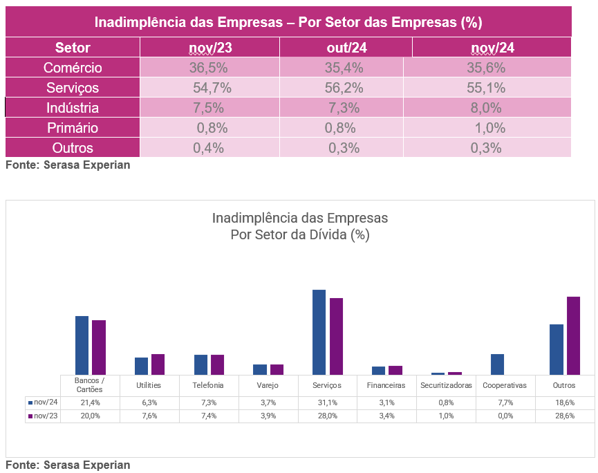 “Com a alta da taxa de juros, o acesso ao crédito para as empresas fica mais limitado e mais caro. Isso afeta diretamente a capacidade das companhias de gerenciar seu fluxo de caixa e cumprir suas obrigações financeiras. Além disso, os juros altos podem reduzir a demanda por produtos e serviços, pois consumidores e negócios enfrentam custos de crédito mais elevados, resultando em menor receita. Esse cenário cria um ciclo vicioso: o difícil acesso ao crédito e a queda na receita prejudicam a saúde financeira das empresas, elevando a inadimplência e tornando o ambiente de crédito ainda mais restritivo”, avalia Camila Abdelmalack, economista da Serasa Experian. Ainda de acordo com o indicador, a maioria dos atrasos foram registrados no setor de “Serviços” (55,1%) seguido por “Comércio” (35,6%). Em relação ao setor das dívidas, a categoria de “Serviços” também representou a maior parte delas (31,1%) seguida por “Bancos e Cartões” (21,4%). Veja, na tabela e no gráfico a seguir, o detalhamento destes recortes: