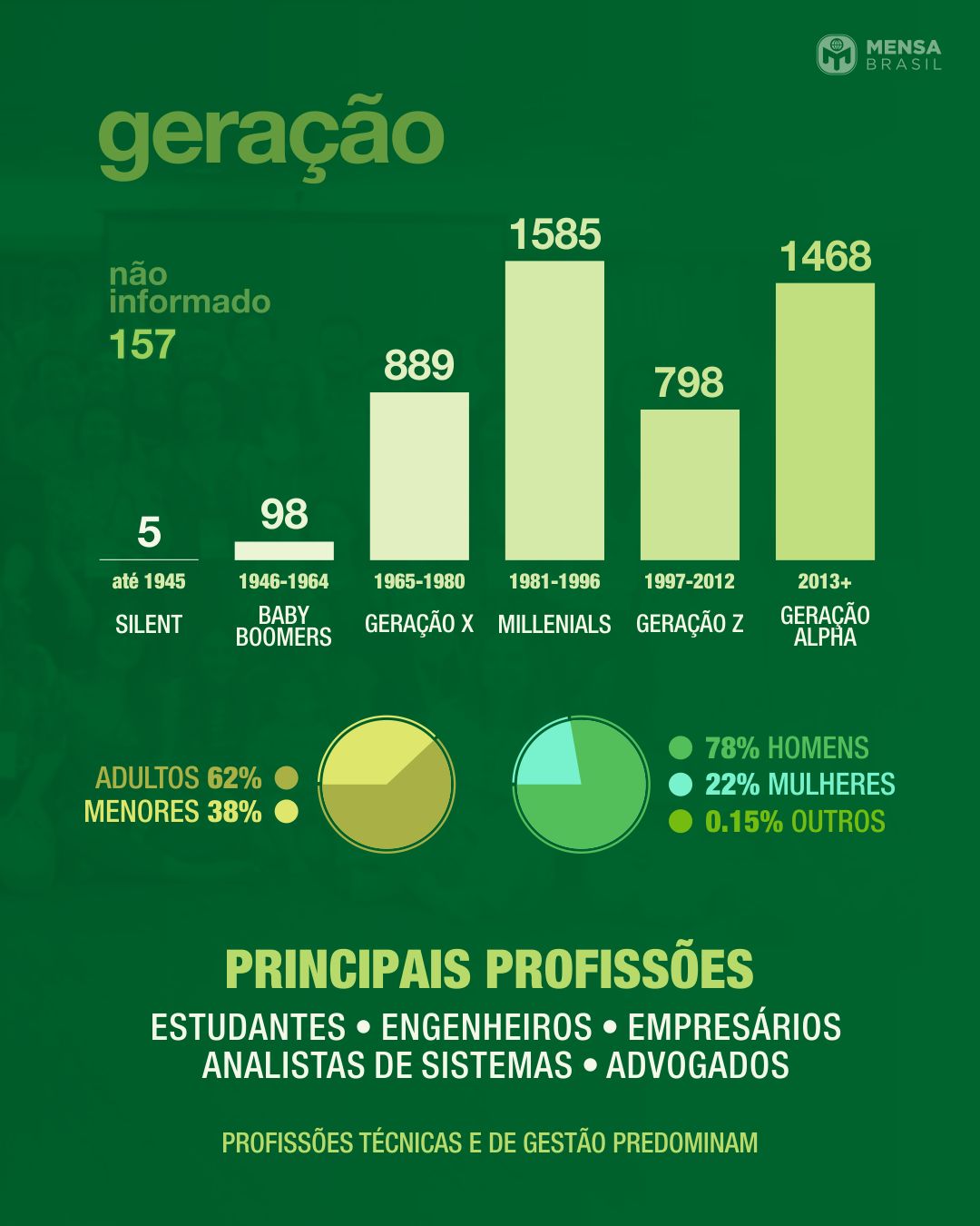 Os chamados Baby Boomers (nascidos 1946 e 1964) são representados por 98 identificados e a Geração Slient (nascidos até 1945) com apenas 5. O total de superinteligentes identificados pela Mensa Brasil coloca o País na sexta posição do ranking global da Mensa Internacional, junto com o Japão, que também possui o mesmo número de indíviduos mapeados. Na primeira colocação, aparecem os Estados Unidos, com cerca de 43 mil identificações, seguidos pelas Ilhas Britânicas, com 17 mil, Alemanha, com 16 mil, Suécia, com 7,2 mil, e República Tcheca, com 6 mil.