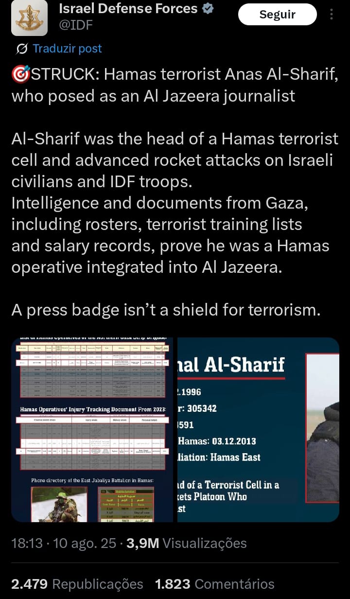 As Forças de Defesa de Israel (IDF) anunciaram ter eliminado Anas Al-Sharif — um dos líderes do Hamas que se fazia passar por jornalista da rede Al Jazeera.