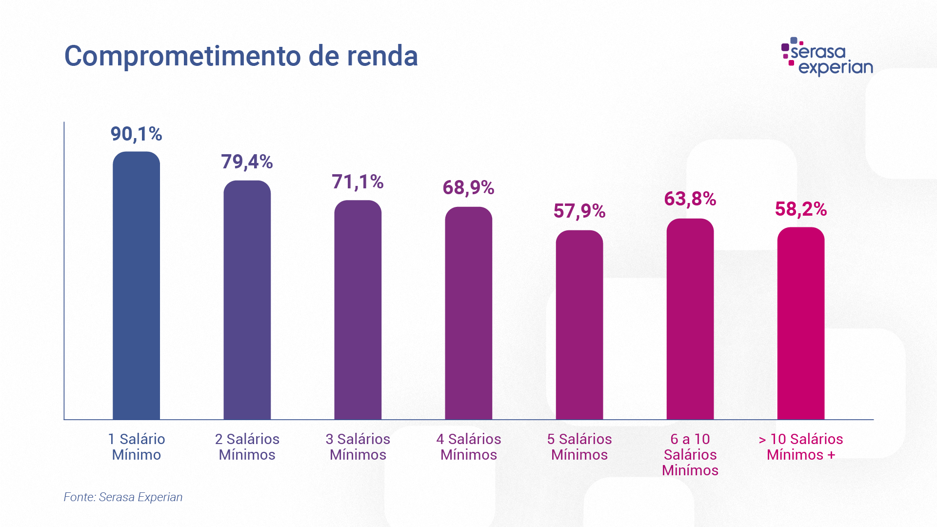 Olhando para o comprometimento por faixas salariais, os brasileiros que ganham até 3 salários-mínimos, apresentam o maior percentual médio comprometido, conforme gráfico abaixo. As porcentagens são: até um salário-mínimo, 90,1%, dois salários-mínimos, 79,4% e três, 71,1%.