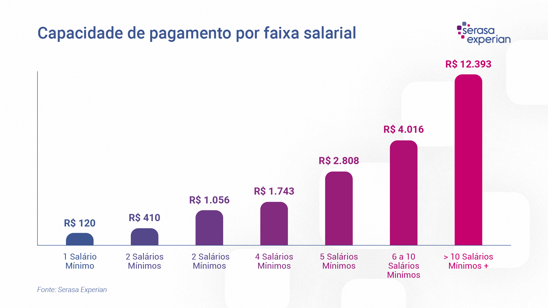 Quanto maior a faixa salarial, maior a capacidade de pagamento, conforme o gráfico abaixo. Olhando para renda de até um salário-mínimo, a capacidade de pagamento é de R$120,00. Para dois salários-mínimos, a capacidade quase quadriplica, atingindo R$410,00. E para três salários-mínimos, o valor chega a R$1.056,00.