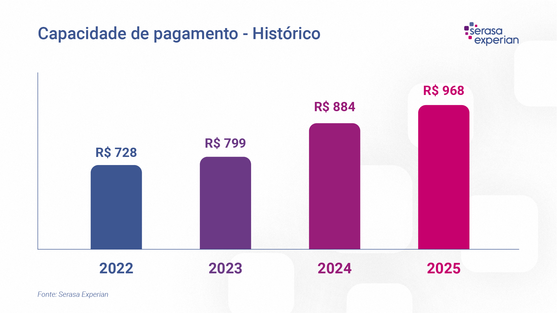 A capacidade de pagamento vem aumentando ao longo dos anos, como ilustrado abaixo. De 2022 para 2025, houve um crescimento de mais de 30%, saindo de R$728,00 para R$968,00. Isso representa mais de 5% acima da correção do salário-mínimo nesse período.