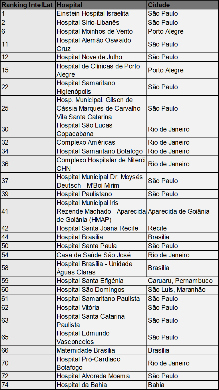 Entre os seis melhores brasileiros estão: Einstein Hospital Israelita, Hospital Sírio-Libanês, Hospital Moinhos de Vento, Hospital Nove de Julho, Hospital de Clínicas de Porto Alegre e Complexo Hospitalar de Niterói (CHN).