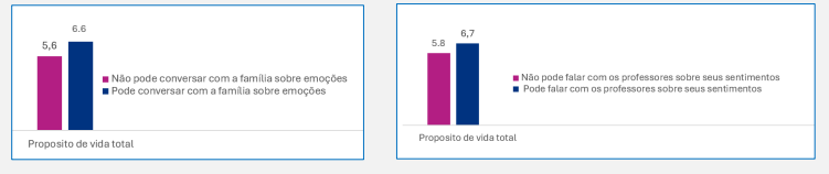 O estudo também mostra que fatores internos e externos alteram significativamente os níveis de propósito de vida do estudante, que representa a capacidade destes de estabelecerem objetivos e trabalharem em direção a eles. Os jovens que podem contar com seus responsáveis para falar sobre suas emoções apresentaram índices de propósito de vida 20% maiores do que aqueles que não contam com esse fator dentro de casa (de 5,6 para 6,6 em uma escala de zero a dez, conforme gráfico abaixo).